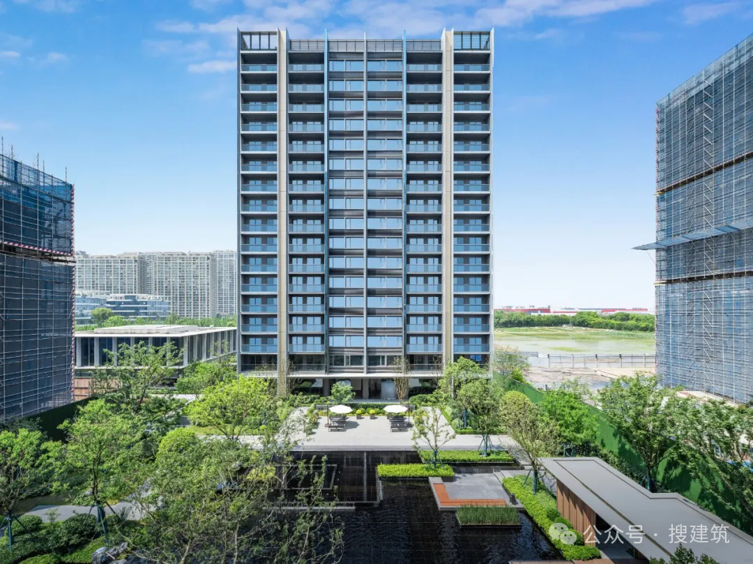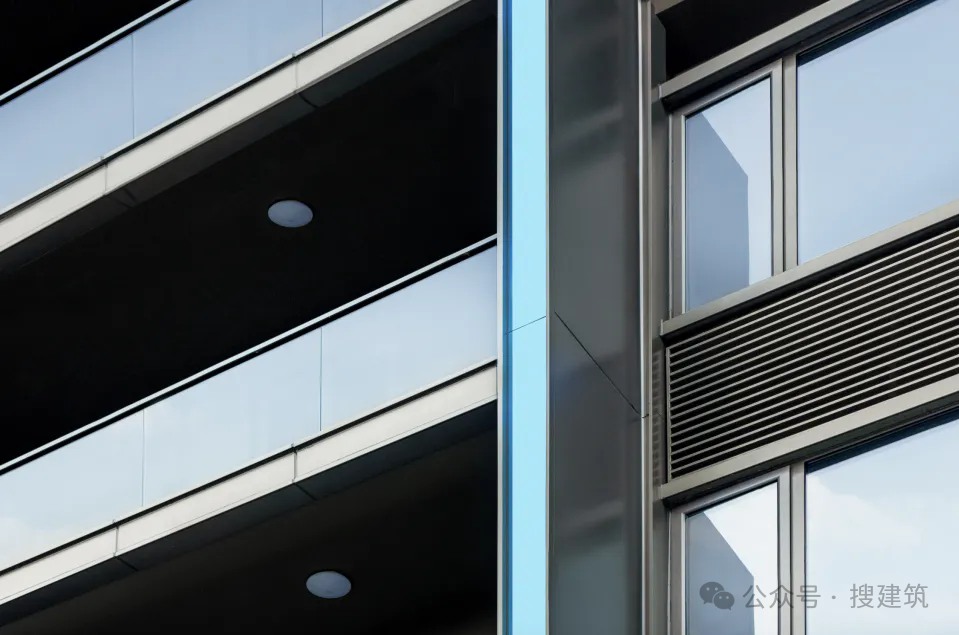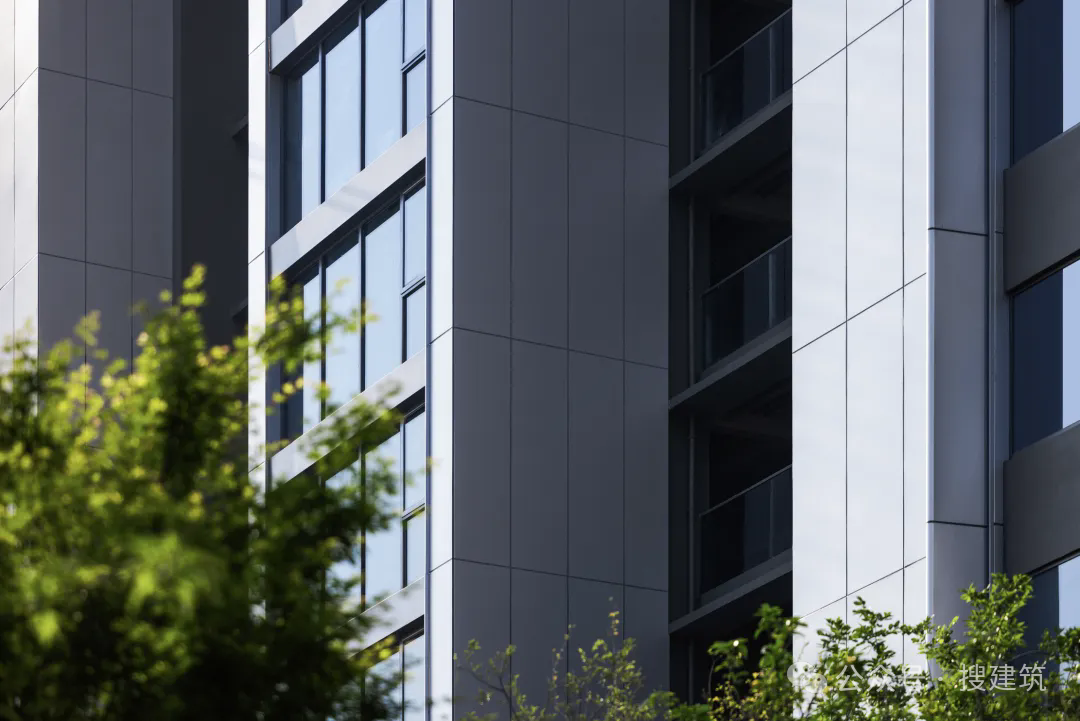 在常見銀色、深灰、米色的外立面顏色中,加入了藍(lán)色進(jìn)行跳色點(diǎn)綴,讓立面更為生動(dòng)。另外外立面還使用LOW-E灰玻璃與豎向機(jī)翼形圓弧鋁板相交融,擴(kuò)大透光面的同時(shí)進(jìn)一步提升了戶與戶之間的隱私性。