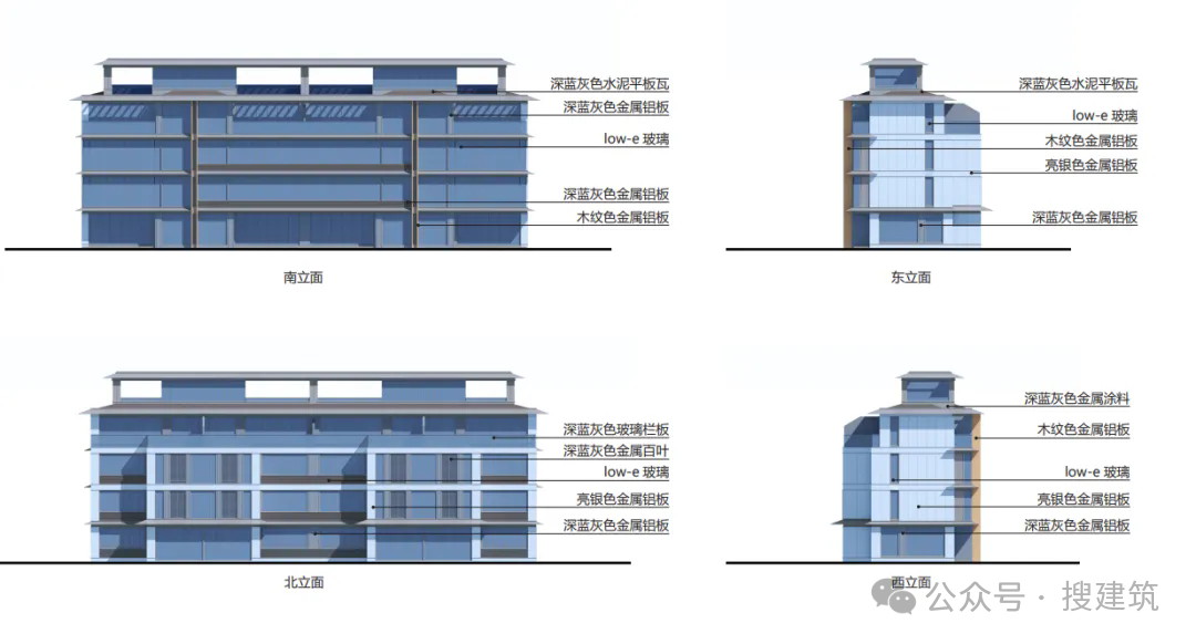 不僅南北立面,是造價(jià)昂貴的鋁板外,就連易于忽視的兩側(cè)山墻,同樣也是鋁板等高階型材干掛。