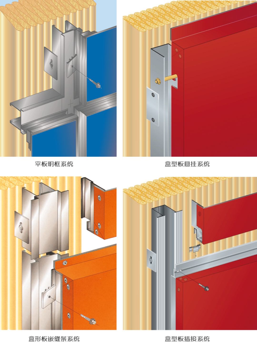 常見的開放式幕墻安裝系統(tǒng)有平板明框系統(tǒng)、盒型板懸掛系統(tǒng)、盒形板嵌縫條系統(tǒng)、盒型板插接系統(tǒng)等。