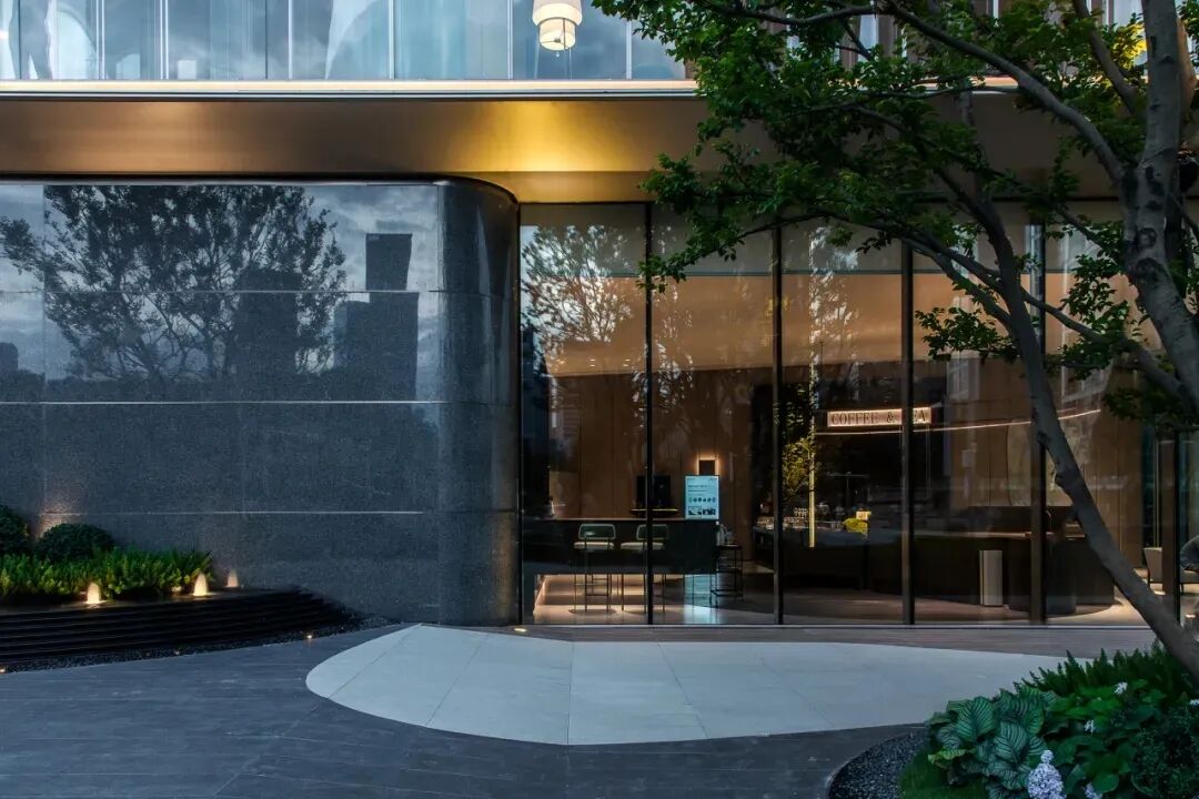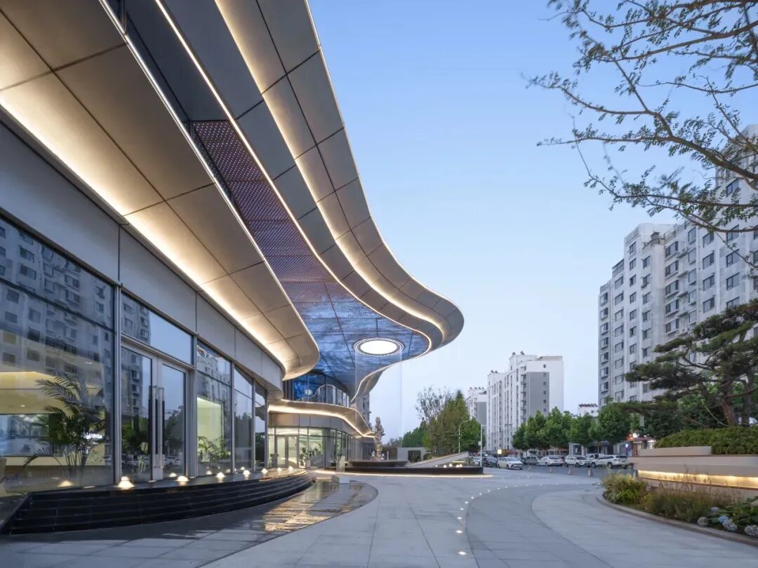 建筑主入口的圓角呈現(xiàn)的是一種打開的姿態(tài),將自然彎曲曲線融入立面,超9米外挑曲線造型,超大挑高,強(qiáng)化了酒店式禮遇感。建筑實(shí)景 建筑攝影:淺深攝影