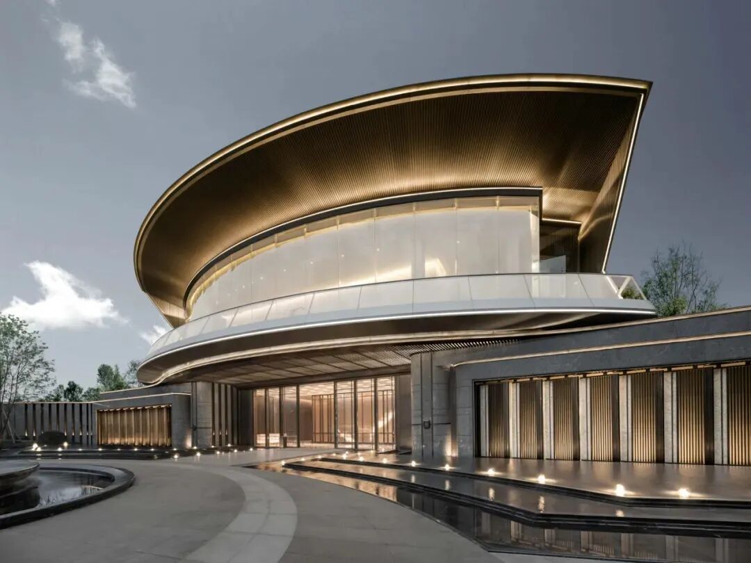 設(shè)計(jì)團(tuán)隊(duì)根據(jù)區(qū)域背景進(jìn)行設(shè)計(jì),提取建筑形態(tài)和符號(hào),項(xiàng)目示范區(qū)售樓處建筑采用對(duì)稱的形體構(gòu)圖,一層灰色石材、古銅色鋁板及金屬線條的使用,營(yíng)造出酒店般奢華尊貴感受;二層弧面玻璃、淺色鋁板又形成輕盈時(shí)尚的氣質(zhì)。