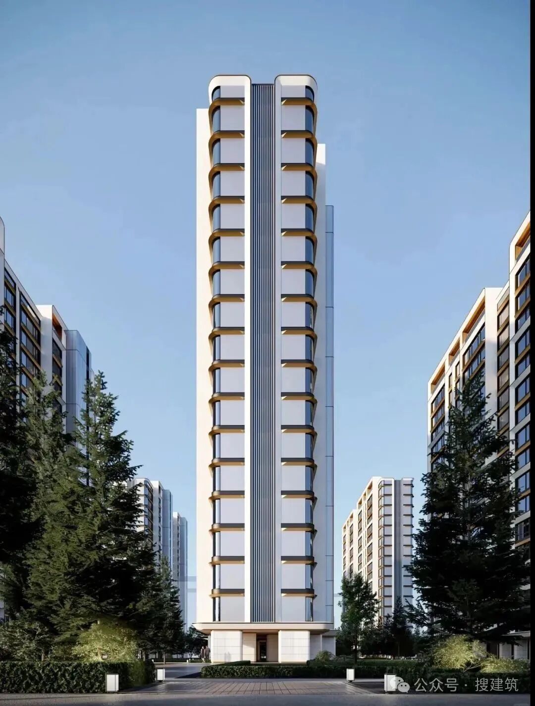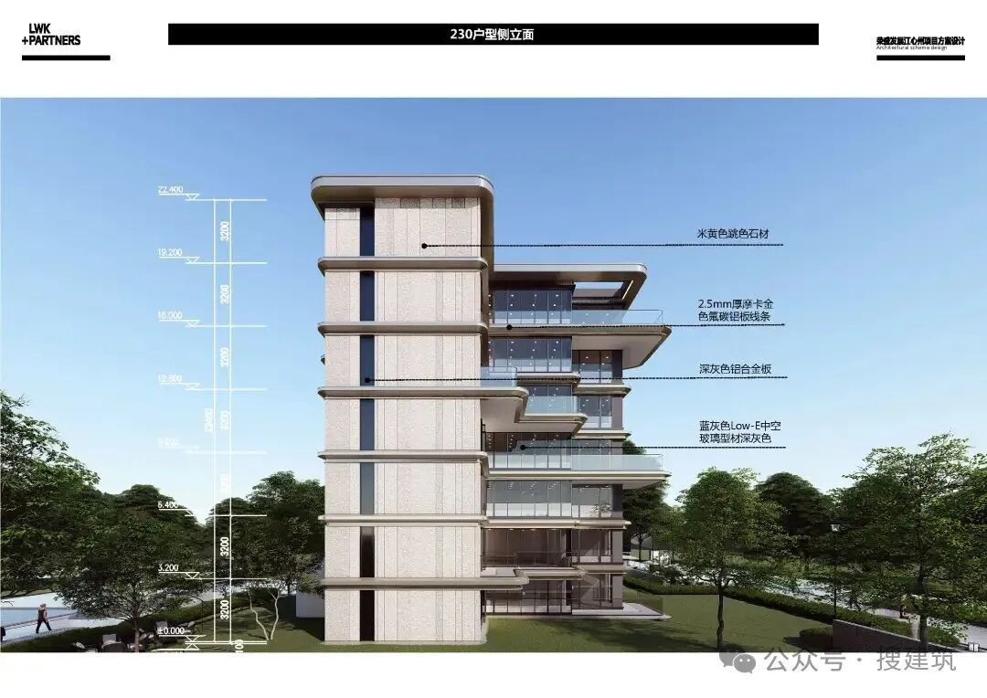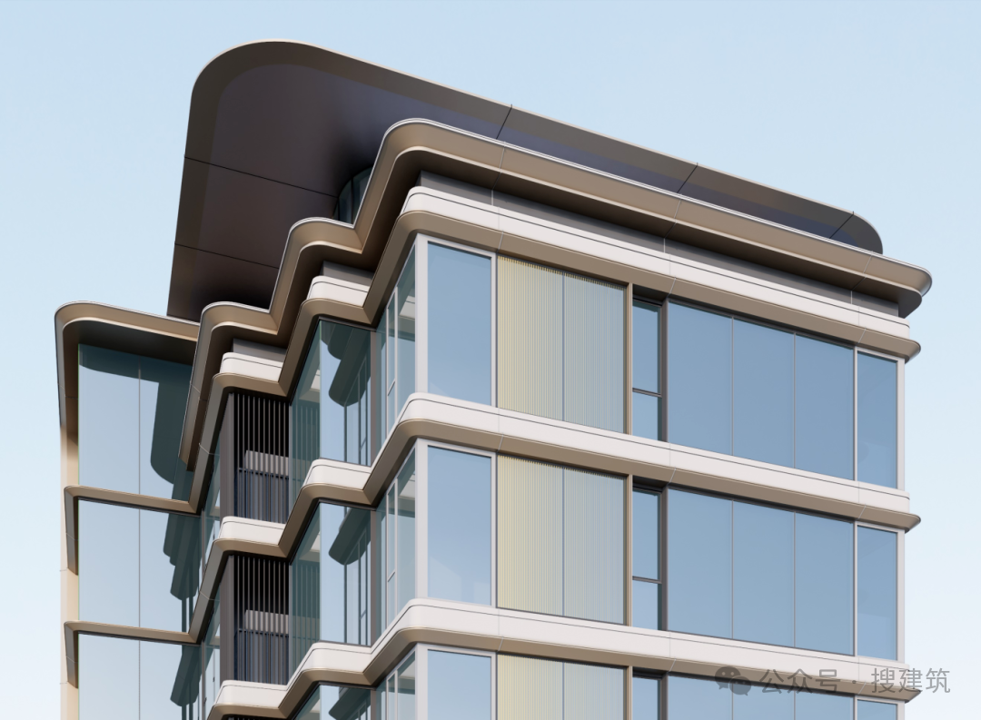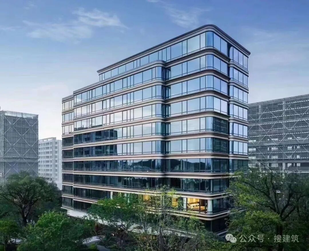 比如,杭州偉星·詠濱名邸項(xiàng)目,鋁板飾面搭配蕓金色金屬收邊,大面積煙墨色玻璃鏡幕,山礬白的流動(dòng)線條,弧形的立面形態(tài)呈現(xiàn)出江水的流線形視覺效果。