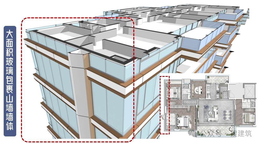 在山墻實(shí)體墻外附加玻璃,整體立面更顯輕盈靈動(dòng),同時(shí),尤其是對(duì)于主立面為玻璃時(shí),增加了建筑整體的連貫性、天幕感