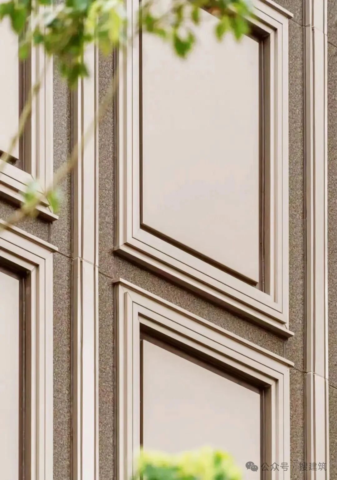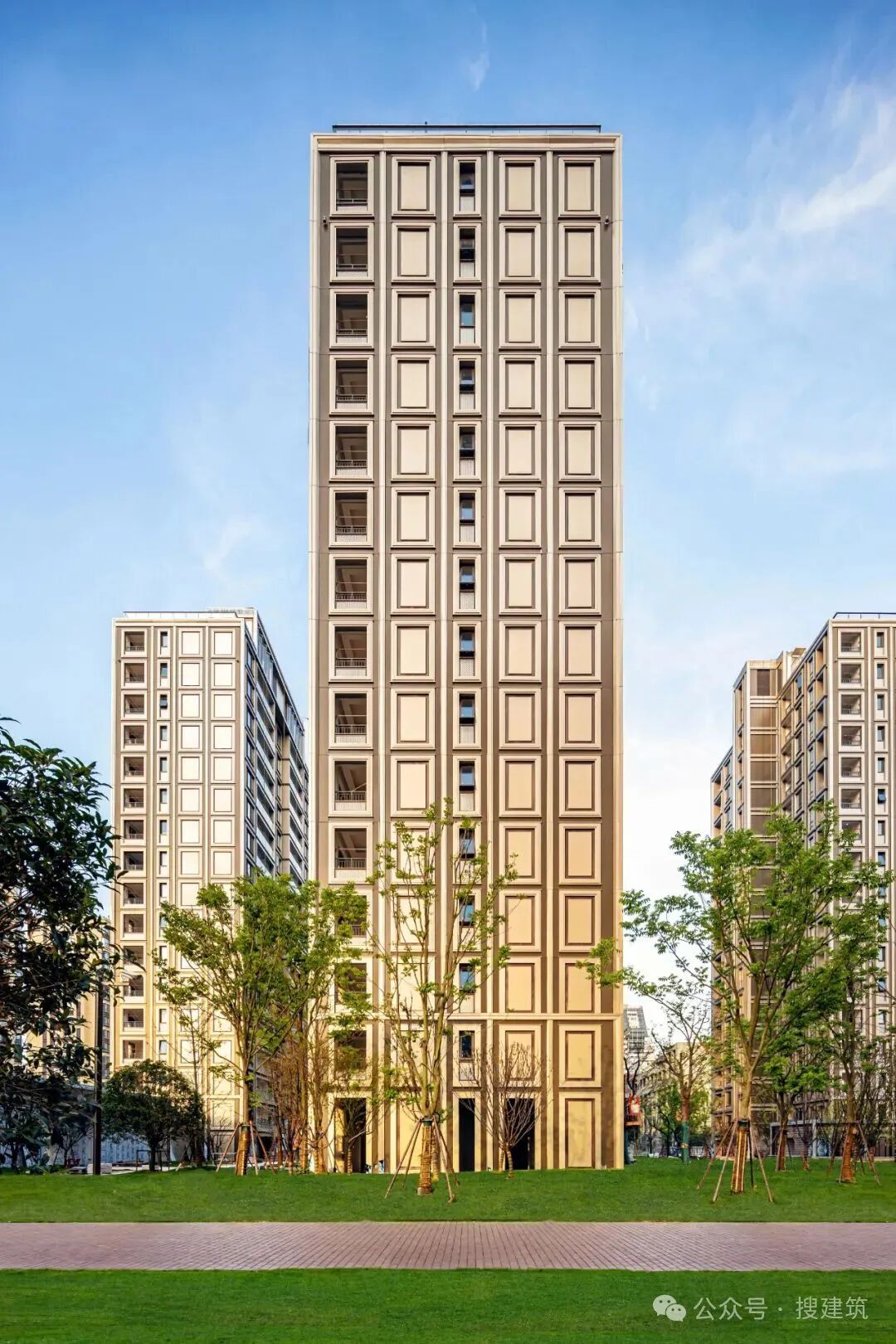 再比如,杭州錦繡公館建筑外立面以金屬?gòu)?fù)合板為主,外窗采用中空Low-E玻璃。香檳金色鋁復(fù)合板與玻璃幕墻幾何圖形拼接、搭配,挺拔、優(yōu)雅的格調(diào)處理,有別于其他公寓的簡(jiǎn)單處理。